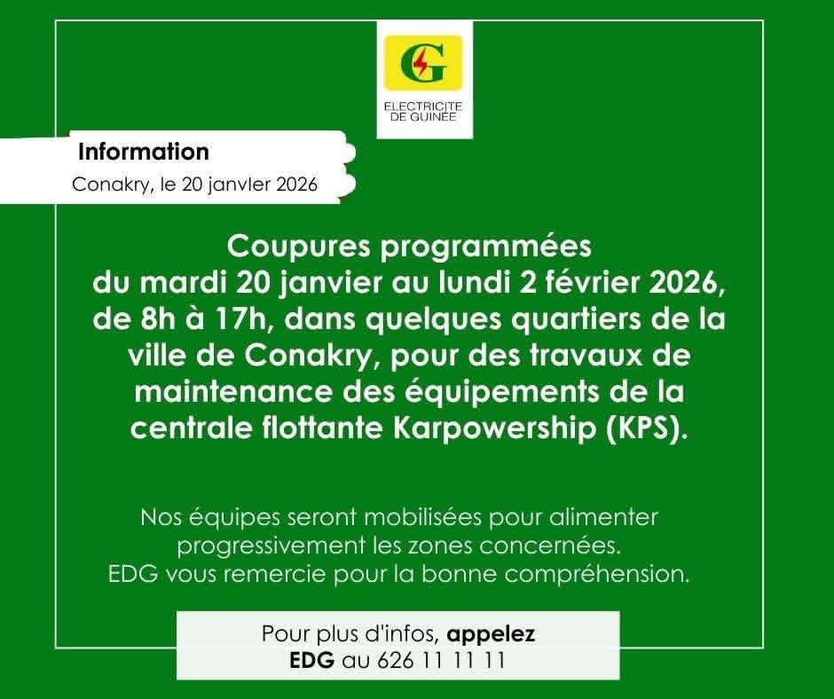 Dans un communiqué publié sur sa page, la société Électricité de Guinée (EDG) a annoncé une série de délestages programmés dans plusieurs quartiers de la capitale, s’étendant du mardi 20 janvier au lundi 2 février 2026.