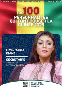 Parmi les 100 personnalités distinguées cette année, figure Madame Maria Diané, Secrétaire Générale de la Confédération Générale des Entreprises de Guinée (CGE-GUI).